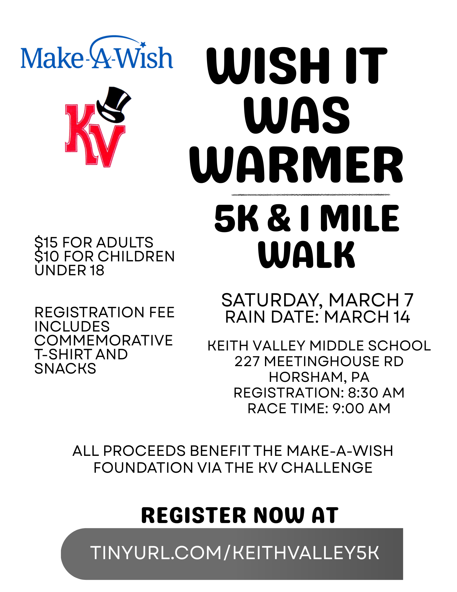 Please consider signing up and participating in our Wish it was Warmer 5k run/1 mile walk at KV on March 7th! All proceeds benefit the KV Challenge & Make-a-Wish Foundation. Details & sign ups are in the link here: first annual (1).png (1545×2000)